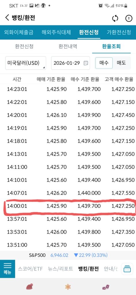 당시 시각은 오후 2시경. 환전 후 찍힌 환율은 1,439.7원이었습니다.